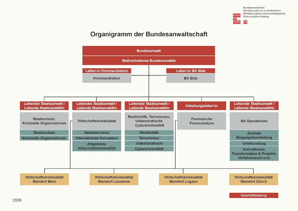 Die Bundesanwaltschaft (BA) ist eine autonome und institutionell unabhängige Bundesbehörde. Sie handelt als Staatsanwaltschaft auf Bundesebene gestützt auf Art. 7 des Strafbehördenorganisationsgesetzes (StBOG; SR 173.71).