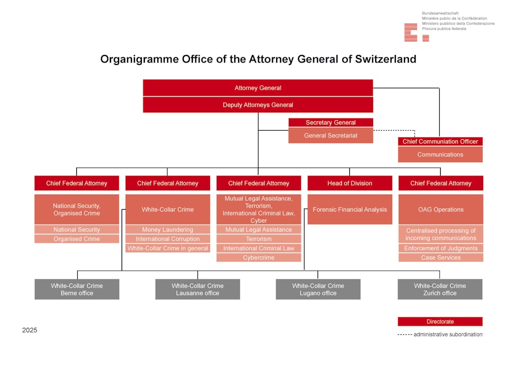 The Office of the Attorney General of Switzerland (OAG) is an autonomous and institutionally independent federal authority. It acts as the federal criminal prosecution authority pursuant to Art. 7 of the Federal Act on the Organisation of Criminal Justice Authorities (StBOG; SR 173.71).